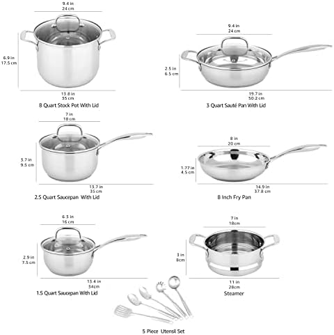 - Lot de 15 pièces comprenant une poêle à frire, plusieurs casseroles et ustensiles en acier inoxydable pour une cuisine complète.