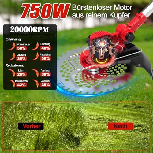 - Moteur Brushless puissant de 750W offrant une vitesse de rotation maximale de 18 000 tr/min pour couper herbe épaisse, ronces et branches jusqu'à 3 cm.