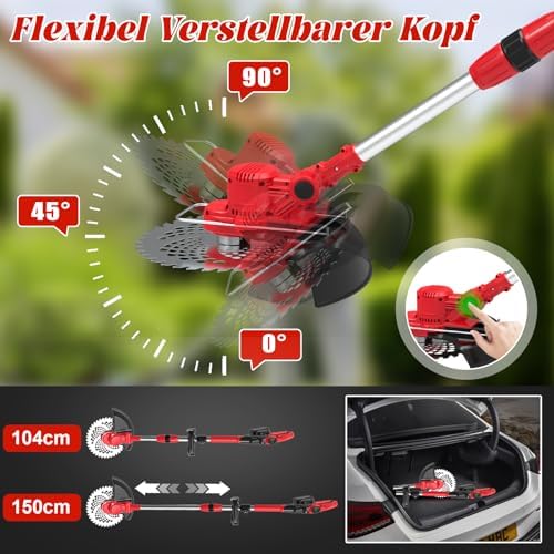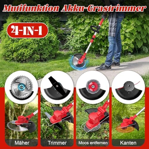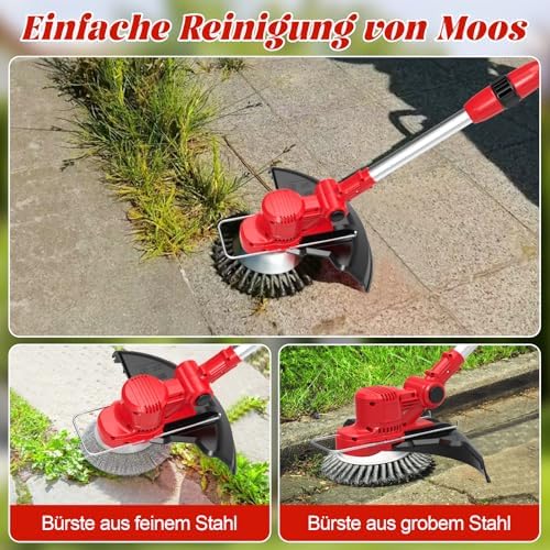 - 4 lames interchangeables pour s'adapter à tout type de terrain : corde en nylon, lame en acier inoxydable, disque à dents en acier au manganèse et brosse à mousse.