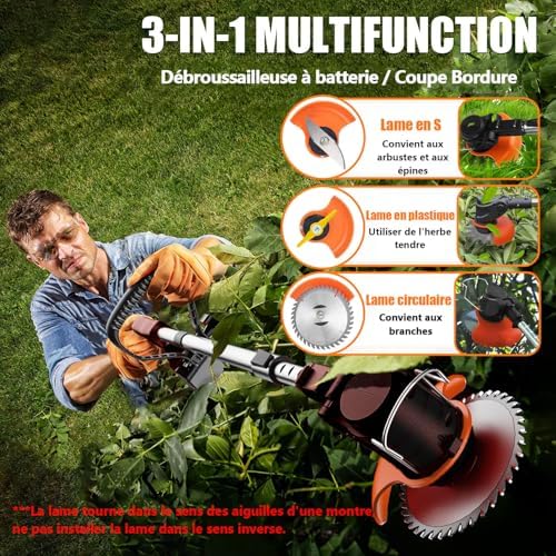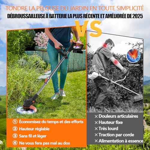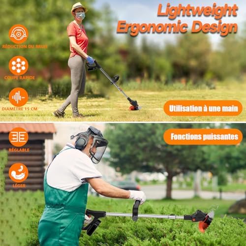 - Facile à monter et à utiliser, la débroussailleuse électrique sans fil est légère et ergonomique, réduisant la fatigue.