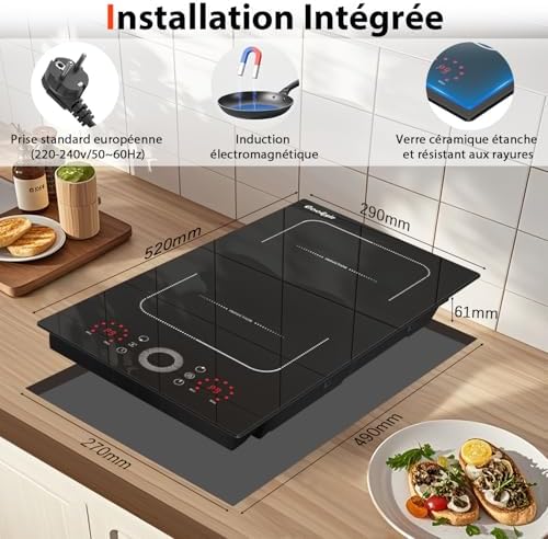 - Dimensions de la plaque : 29x52x6,1 cm, à installer sur une découpe de 49x27 cm avec espace de refroidissement.