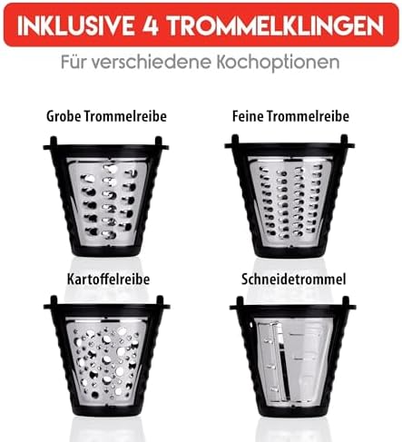 - Mandoline avec 4 lames : râpe fine, râpe épaisse, tambour à purée et tambour à trancher pour des préparations variées.